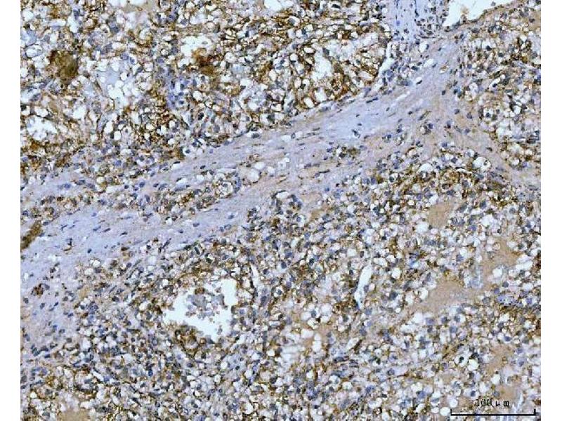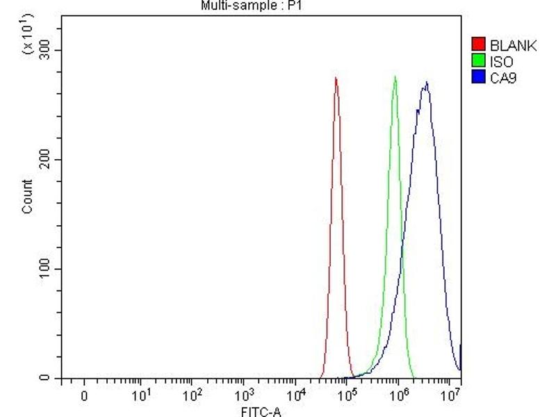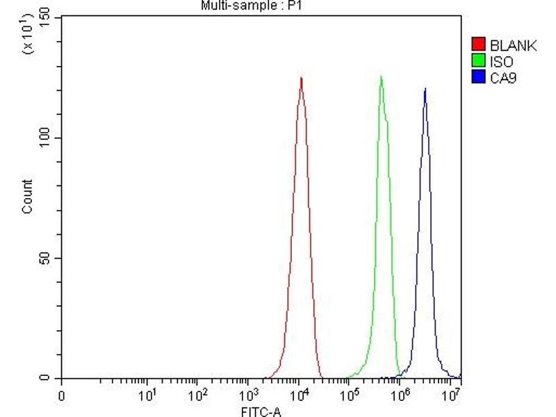 Background: Carbonic anhydrase IX (CA9/CA IX) is an enzyme that in humans is encoded by the CA9 gene. Carbonic anhydrases (CAs) are a large family of zinc metalloenzymes that catalyze the reversible hydration of carbon dioxide. They participate in a variety of biological processes, including respiration, calcification, acid-base balance, bone resorption, and the formation of aqueous humor, cerebrospinal fluid, saliva, and gastric acid. They show extensive diversity in tissue distribution and in their subcellular localization. CA IX is a transmembrane protein and is one of only two tumor-associated carbonic anhydrase isoenzymes known. It is expressed in all clear-cell renal cell carcinoma, but is not detected in normal kidney or most other normal tissues. It may be involved in cell proliferation and transformation. This gene was mapped to 17q21.2 by fluorescence in situ hybridization, however, radiation hybrid mapping localized it to 9p13-p12.