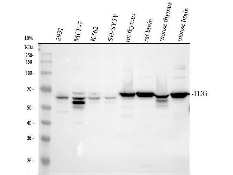 - Anti-TDG Antibody (ABIN7600107). Tested in ELISA, Flow Cytometry, WB applications. This antibody reacts with Human, Monkey. This is a premium antibody that guarantees superior quality, high affinity, and strong signals with minimal background in Western blot applications.