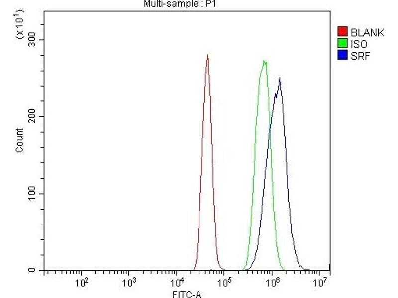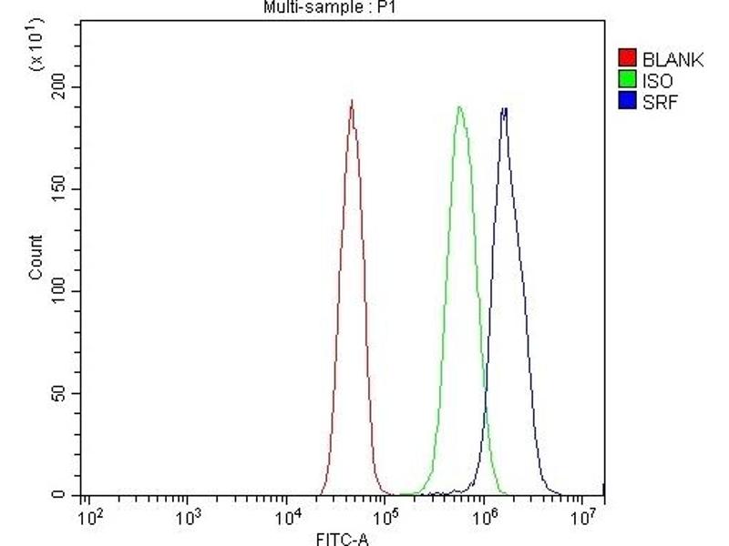Background: Serum response factor, also known as SRF, is a transcription factor protein. This gene encodes a ubiquitous nuclear protein that stimulates both cell proliferation and differentiation. It is a member of the MADS (MCM1, Agamous, Deficiens, and SRF) box superfamily of transcription factors. This protein binds to the serum response element (SRE) in the promoter region of target genes. This protein regulates the activity of many immediate-early genes, for example c-fos, and thereby participates in cell cycle regulation, apoptosis, cell growth, and cell differentiation. This gene is the downstream target of many pathways, for example, the mitogen-activated protein kinase pathway (MAPK) that acts through the ternary complex factors (TCFs). Two transcript variants encoding different isoforms have been found for this gene.