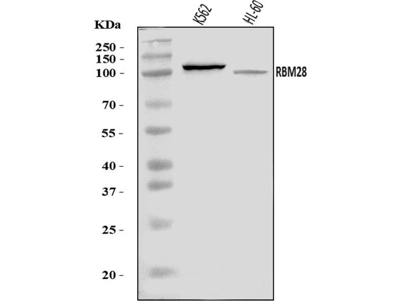 Background: RNA-binding protein 28 is a protein that in humans is encoded by the RBM28 gene. The protein encoded by this gene is a specific nucleolar component of the spliceosomal small nuclear ribonucleoprotein (snRNP)complexes . It specifically associates with U1, U2, U4, U5, and U6 small nuclear RNAs (snRNAs), possibly coordinating their transition through the nucleolus. Mutation in this gene causes alopecia, progressive neurological defects, and endocrinopathy (ANE syndrome), a pleiotropic and clinically heterogeneous disorder. Alternatively spliced transcript variants encoding different isoforms have been found for this gene.