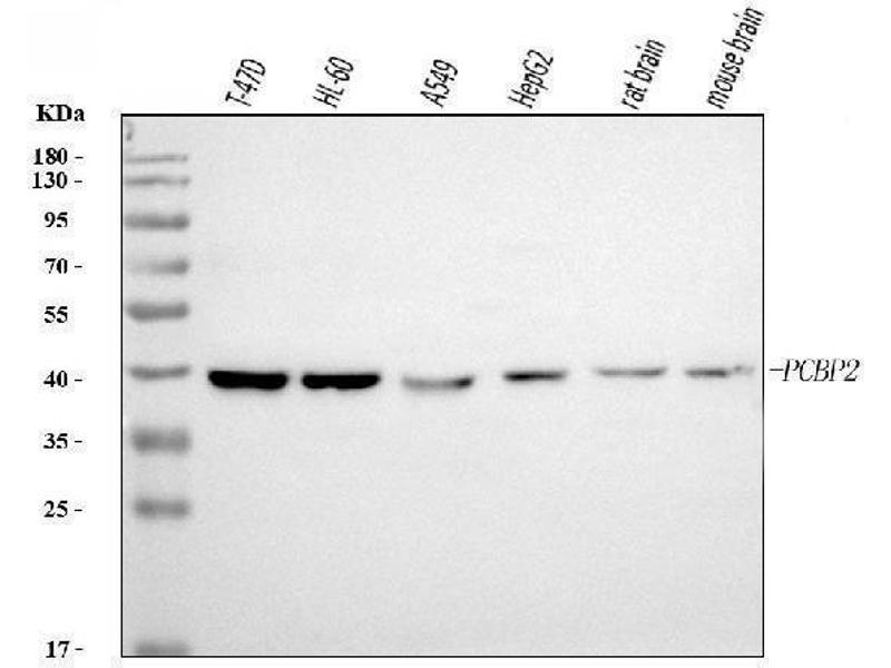Background: Poly(rC)-binding protein 2 is a protein that in humans is encoded by the PCBP2 gene. The protein encoded by this gene appears to be multifunctional. Along with PCBP-1 and hnRNPK, it is one of the major cellular poly(rC)-binding proteins. The encoded protein contains three K-homologous (KH) domains which may be involved in RNA binding. Together with PCBP-1, this protein also functions as a translational coactivator of poliovirus RNA via a sequence-specific interaction with stem-loop IV of the IRES, promoting poliovirus RNA replication by binding to its 5'-terminal cloverleaf structure. It has also been implicated in translational control of the 15-lipoxygenase mRNA, human papillomavirus type 16 L2 mRNA, and hepatitis A virus RNA. The encoded protein is also suggested to play a part in formation of a sequence-specific alpha-globin mRNP complex which is associated with alpha-globin mRNA stability. This multiexon structural mRNA is thought to be retrotransposed to generate PCBP-1, an intronless gene with functions similar to that of PCBP2. This gene and PCBP-1 have paralogous genes (PCBP3 and PCBP4) which are thought to have arisen as a result of duplication events of entire genes. This gene also has two processed pseudogenes (PCBP2P1 and PCBP2P2). Multiple transcript variants encoding different isoforms have been found for this gene.