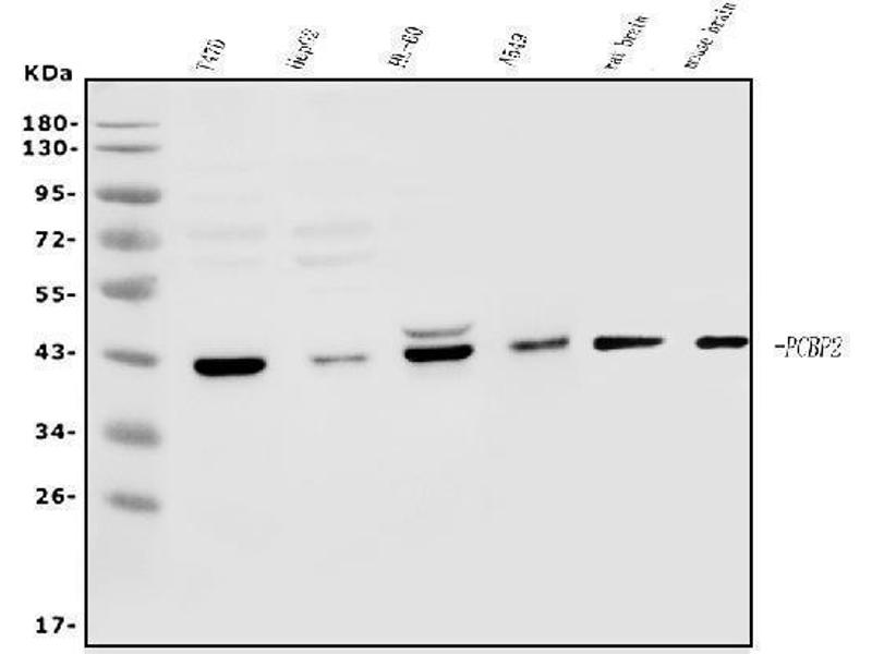 Background: Poly (rC)-binding protein 2 is a protein that in humans is encoded by the PCBP2 gene. The protein encoded by this gene appears to be multifunctional. Along with PCBP-1 and hnRNPK, it is one of the major cellular poly (rC)-binding proteins. The encoded protein contains three K-homologous (KH) domains which may be involved in RNA binding. Together with PCBP-1, this protein also functions as a translational coactivator of poliovirus RNA via a sequence-specific interaction with stem-loop IV of the IRES, promoting poliovirus RNA replication by binding to its 5'-terminal cloverleaf structure. It has also been implicated in translational control of the 15-lipoxygenase mRNA, human papillomavirus type 16 L2 mRNA, and hepatitis A virus RNA. The encoded protein is also suggested to play a part in formation of a sequence-specific alpha-globin mRNP complex which is associated with alpha-globin mRNA stability. This multiexon structural mRNA is thought to be retrotransposed to generate PCBP-1, an intronless gene with functions similar to that of PCBP2. This gene and PCBP-1 have paralogous genes (PCBP3 and PCBP4) which are thought to have arisen as a result of duplication events of entire genes. This gene also has two processed pseudogenes (PCBP2P1 and PCBP2P2). Multiple transcript variants encoding different isoforms have been found for this gene.