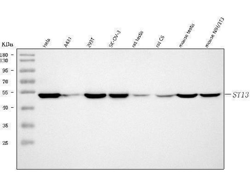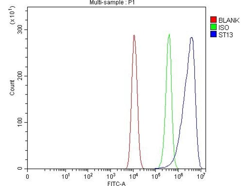 - Anti-ST13 Antibody (ABIN7600493). Tested in ELISA, Flow Cytometry, IF, ICC, WB applications. This antibody reacts with Human, Mouse, Rat. This is a premium antibody that guarantees superior quality, high affinity, and strong signals with minimal background in Western blot applications.