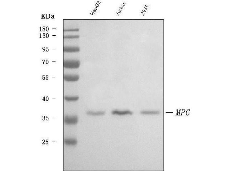 Background: MPG(N-methylpurine-DNA glycosylase) also known as MDG, 3-METHYLADENINE DNA GLYCOSYLASE, 3MeAde DNA GLYCOSYLASE, AAG or APNG. The MPG gene is mapped to human chromosome 16 by analysis of a panel of DNAs from mouse/human and hamster/human hybrid cell lines.TheMPGgene was expressed in all cell lines and tissues examined, but was found at particularly high levels in a colon adenocarcinoma cell line(HT29). The completely characterized humanMPGgene was found to span 7 to 8 kb of genomic DNA and to be localized 75 kb upstream of the embryonic zeta-globin gene. To assess the contribution of Apng to the repair of several mutagenic lesions in vivo,Hang et al.(1997)biochemically analyzed cell-free extracts of tissues from mice with a targeted deletion of the Apng gene. Following treatment with DNA-methylating agents, increased persistence of 7-methylguanine(meG) was found in liver sections of APNG knockout mice in comparison with wildtype mice, demonstrating an in vivo phenotype for the APNG-null animals.