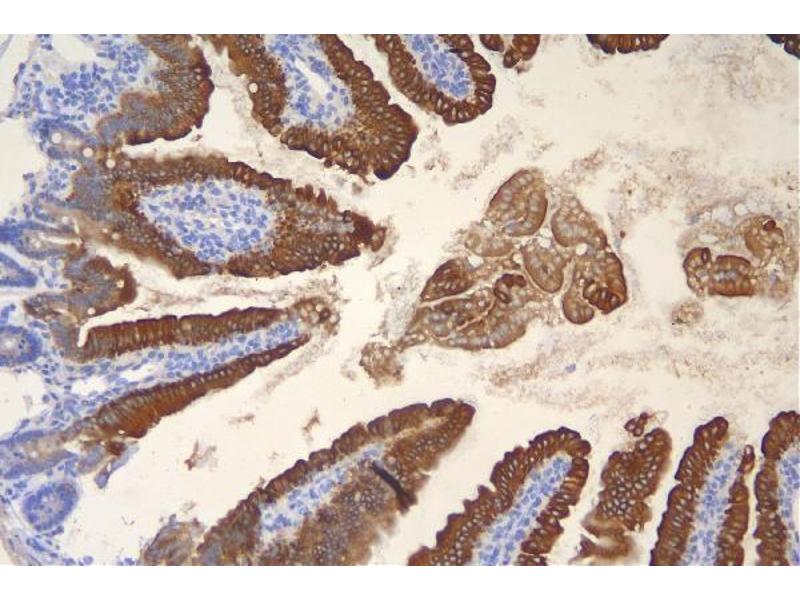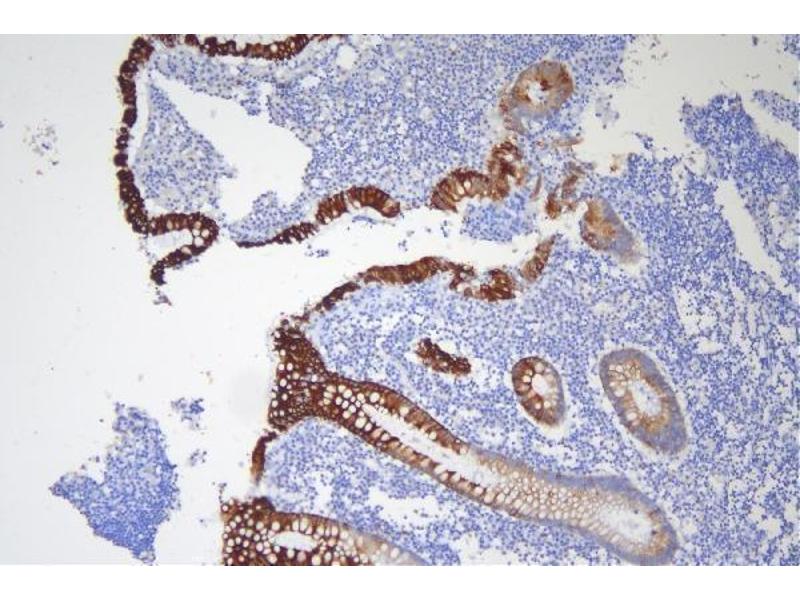Tissue Specificity: Expressed at low levels in the more differentiated suprabasal regions of the small intestine, and at higher levels in the colon, mainly in the upper region and in scattered cells throughout the remaining epithelium. Also expressed in epithelial cells of bladder, ileum and stomach and at lower levels in pancreas and earskin. The phosphorylated form is nearly exclusively expressed in goblet cells of the small intestine and in the lumen-proximal cells of the colon (at protein level). Also expressed in jejunum and duodenum.
