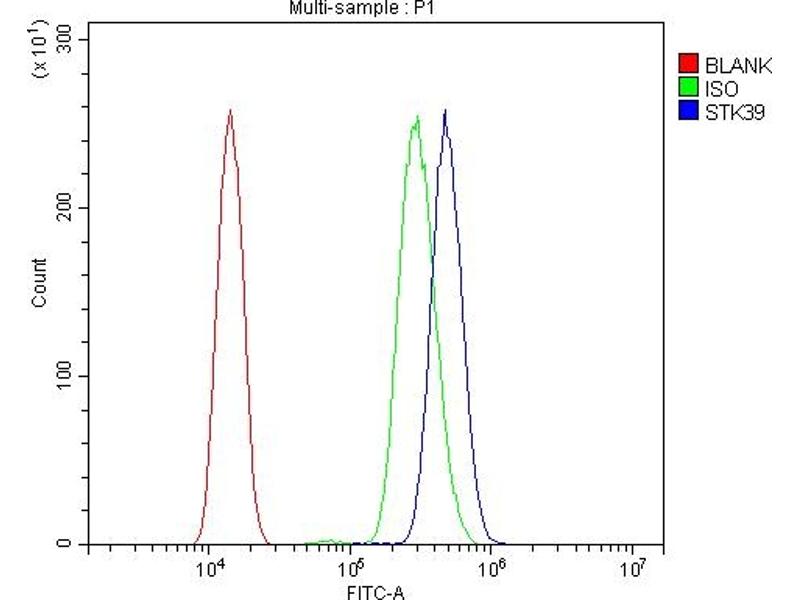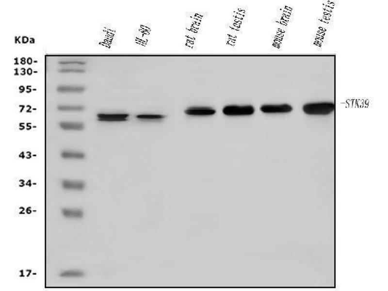 Background: STE20/SPS1-related proline-alanine-rich protein kinase is an enzyme that in humans is encoded by the STK39 gene. This gene encodes a serine/threonine kinase that is thought to function in the cellular stress response pathway. The kinase is activated in response to hypotonic stress, leading to phosphorylation of several cation-chloride-coupled cotransporters. The catalytically active kinase specifically activates the p38 MAP kinase pathway, and its interaction with p38 decreases upon cellular stress, suggesting that this kinase may serve as an intermediate in the response to cellular stress.