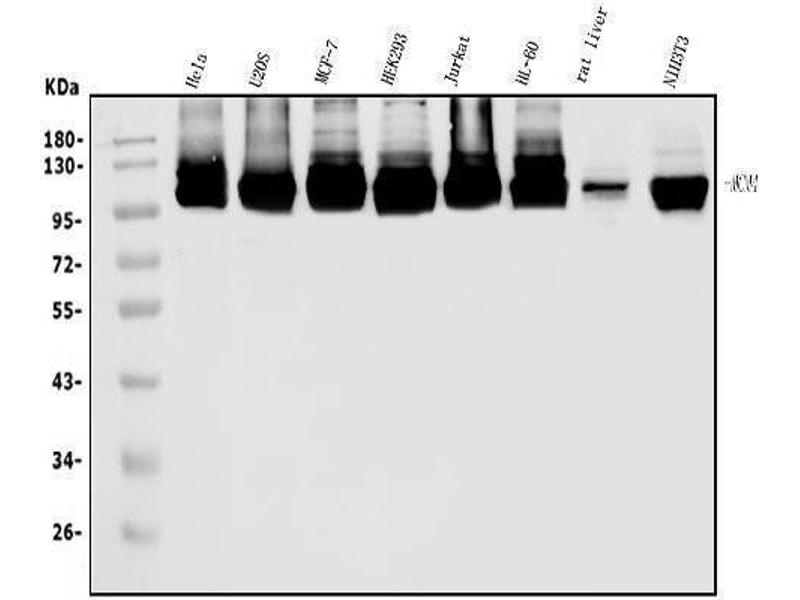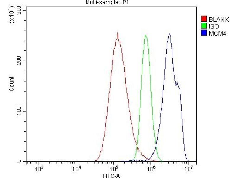 Background: MCM4 (MINICHROMOSOME MAINTENANCE, S. CEREVISIAE, HOMOLOG OF, 4), also called CDC21, S. POMBE, HOMOLOG OF, is a protein that in humans is encoded by the MCM4 gene. MCM4 is one of the highly conserved mini-chromosome maintenance proteins (MCM) that are essential for the initiation of eukaryotic genome replication. The MCM4 gene is mapped to 8q11.21. The 864-amino acid MCM4 protein has an observed molecular mass of 97 kD by SDS-PAGE, which is similar to its calculated molecular mass of 96.6 kD. Western blot analysis with and without phosphatase treatment suggested that MCM4 is highly phosphorylated in mitotic cells. In the absence of DDK, CDK phosphorylation at the distal part of the Mcm4 NSD becomes crucial.MCM4 encodes a subunit of the MCM2-7 complex (also known as MCM2-MCM7), the replication licensing factor and presumptive replicative helicase.