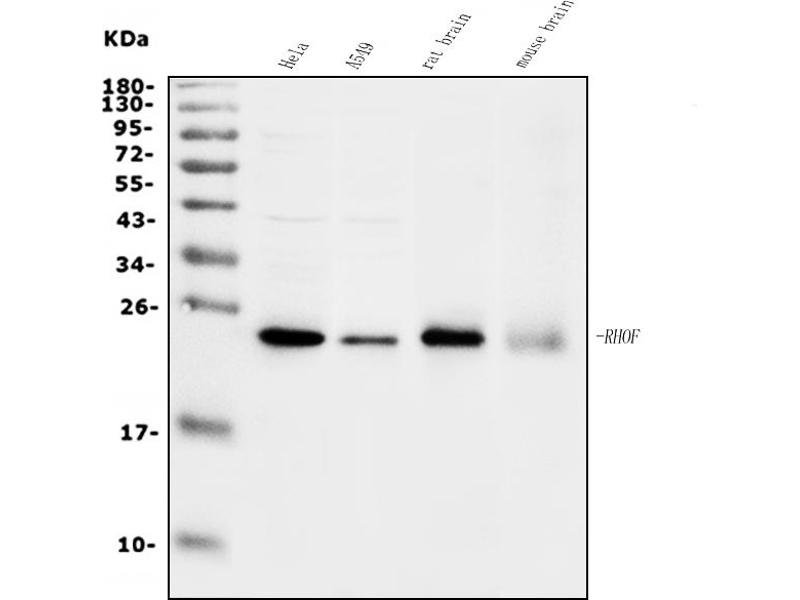 - Anti-RHOF Antibody (ABIN7601568). Tested in ELISA, Flow Cytometry, WB applications. This antibody reacts with Human, Mouse, Rat. This is a premium antibody that guarantees superior quality, high affinity, and strong signals with minimal background in Western blot applications.