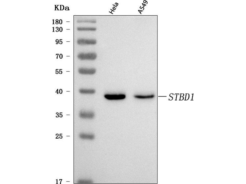 Background: STBD1 may have the capability to bind to carbohydrates. It functions as a glycogen receptor that tethers glycogen to autophagic membranes for delivery and breakdown in lysosomes. STBD1 appears molecular mass of 35-38 kDa band in mouse/rat tissues and 38-43 kDa in human tissue.