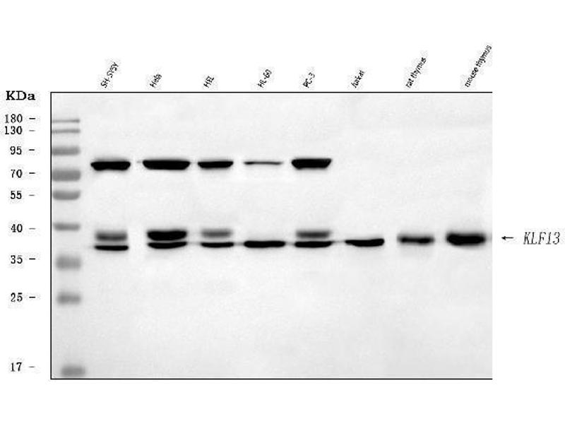 - Anti-KLF13 Antibody (ABIN7602036). Tested in ELISA, Flow Cytometry, IHC, WB applications. This antibody reacts with Human, Mouse, Rat. This is a premium antibody that guarantees superior quality, high affinity, and strong signals with minimal background in Western blot applications.