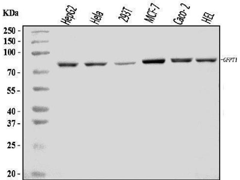 - A synthetic peptide corresponding to a sequence at the C-terminus of human GFPT1, identical to the related mouse and rat sequences.