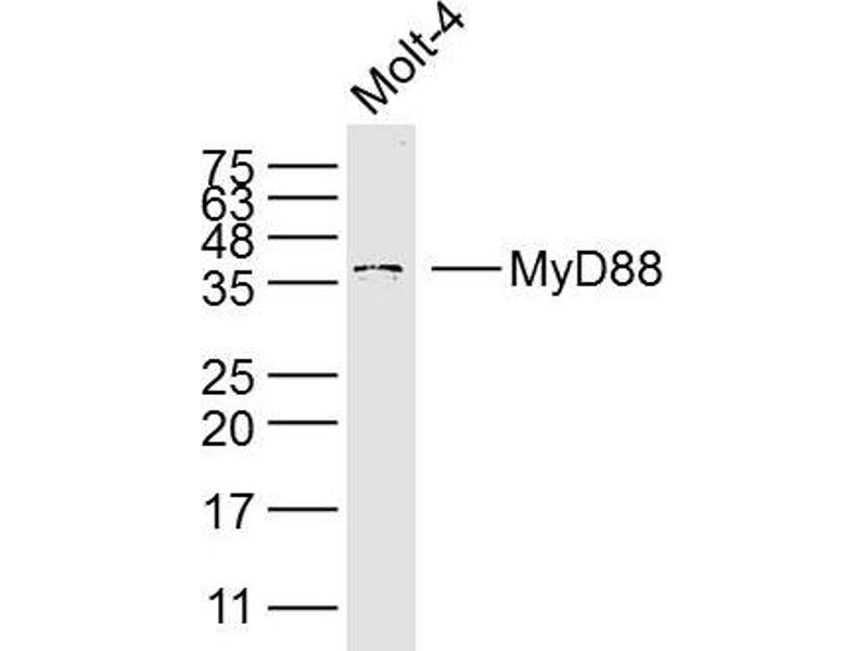 Background: Adapter protein involved in the Toll-like receptor and IL-1 receptor signaling pathway in the innate immune response. Acts via IRAK1, IRAK2, IRF7 and TRAF6, leading to NF-kappa-B activation, cytokine secretion and the inflammatory response. Increases IL-8 transcription. Involved in IL-18-mediated signaling pathway. Isoform 2 is defective in its ability to induce IRAK phosphorylation and NF-kappa-B activation and can function as a negative regulator of activation by IL-1 or lipopolysaccharide (LPS). Activates IRF1 resulting in its rapid migration into the nucleus to mediate an efficient induction of IFN-beta, NOS2/INOS, and IL12A genes. MyD88-mediated signaling in intestinal epithelial cells is crucial for maintenance of gut homeostasis and controls the expression of the antimicrobial lectin REG3G in the small intestine.