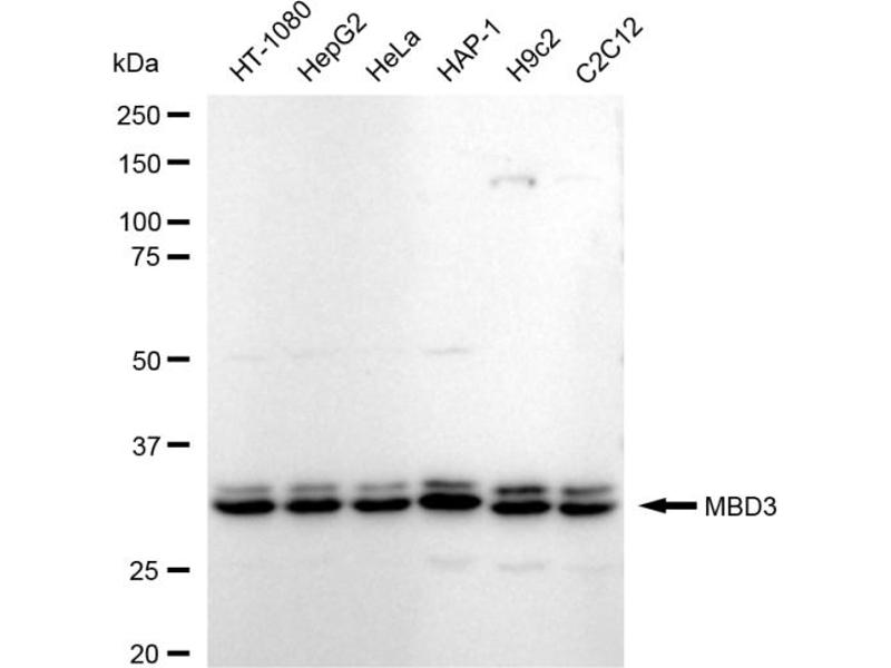 Der Kaninchen Monoklonal anti-MBD3 Antikörper wird verwendet zum Nachweis von MBD3 in Proben von Human. Er wurde validiert für WB, ICC und FACS.