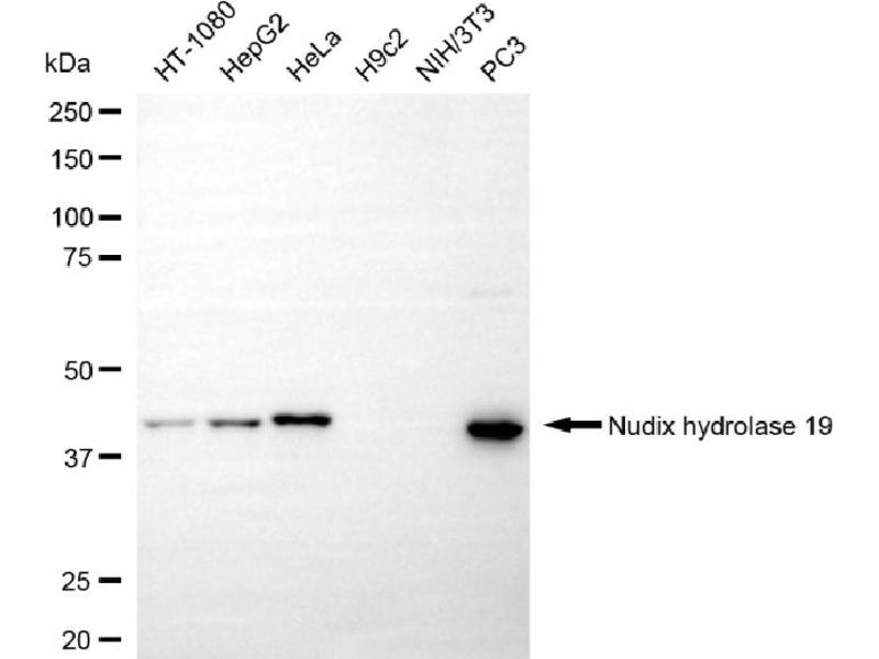 Der Kaninchen Monoklonal anti-Nucleoside Diphosphate-Linked Moiety X Motif 19 Antikörper wird verwendet zum Nachweis von Nucleoside Diphosphate-Linked Moiety X Motif 19 in Proben von Human. Er wurde validiert für FACS und WB.