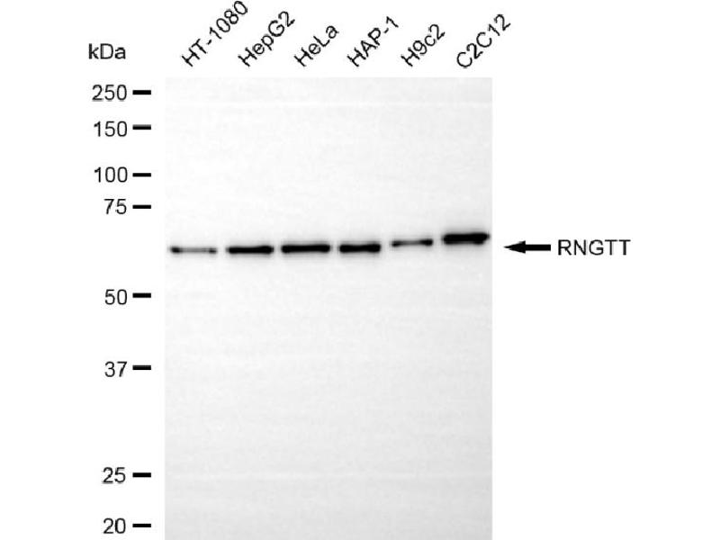 Der Kaninchen Monoklonal anti-RNGTT Antikörper (Klon 25GB4670) (ABIN7800259) detektiert spezifisch RNGTT in WB und FACS.