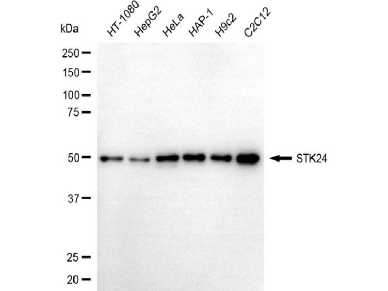 Dieser Kaninchen Monoklonal Antikörper detektiert spezifisch STK24 in WB. Es zeigt Reaktivität gegenüber Proben von Human.