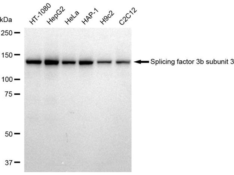 Dieser Kaninchen Monoklonal Antikörper detektiert spezifisch Splicing Factor 3B in FACS und WB. Es zeigt Reaktivität gegenüber Proben von Human.