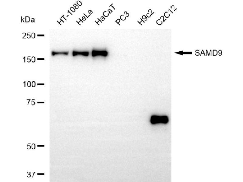 Dieser Kaninchen Monoklonal Antikörper detektiert spezifisch SAMD9 in WB und FACS. Es zeigt Reaktivität gegenüber Proben von Human.