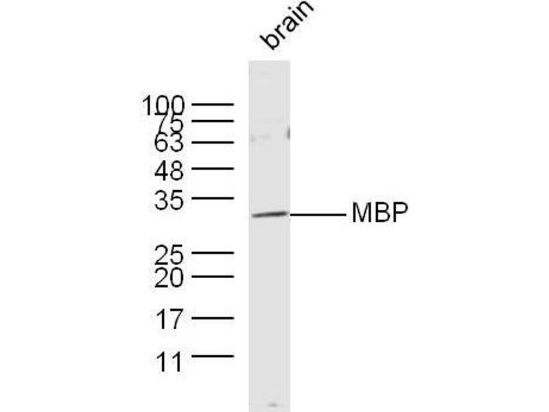 Background: Oligodendrocyte Marker The classic group of Myelin basic protein (MBP) isoforms (isoforms 4 to 14) are with PLP the most abundant protein components of the myelin membrane in the CNS. They have a role in both its formation and stabilization. The smaller isoforms might have an important role in remyelination of denuded axons in multiple sclerosis. The non classic group of MBP isoforms (isoforms 1 to 3/Golli MBPs) may preferentially have a role in the early developing brain long before myelination, maybe as components of transcriptional complexes, and may also be involved in signaling pathways in T cells and neural cells. Differential splicing events combined to optional posttranslational modifications give a wide spectrum of isomers, each of them having maybe a specialized function.
