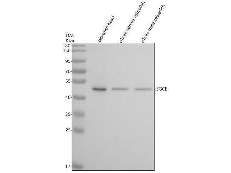 - Anti-Zebrafish SGCE Antibody catalog # AZQ6DHH1. Tested in WB applications. This antibody reacts with Zebrafish. This is a premium antibody that guarantees superior quality, high affinity, and strong signals with minimal background in Western blot applications.
