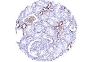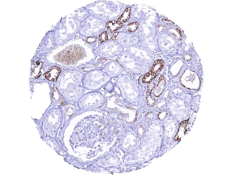 Positive Control: Kidney: A strong membranous L1CAM staining should be seen in a subset of collecting ducts while the vast majority of tubuli remains L1CAM negative.