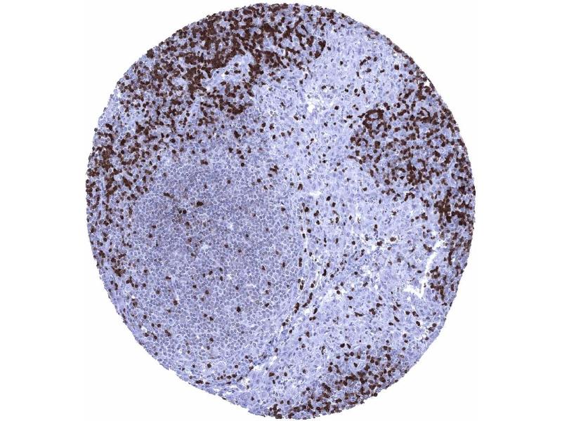 Positive Control: Tonsil: A large fraction of the lymphocytes in the interfollicular areas and few lymphocytes in the germinal centres should show a strong ZAP70 immunostaining.