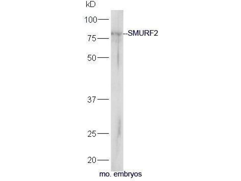 Background: E3 ubiquitin-protein ligase which accepts ubiquitin from an E2 ubiquitin-conjugating enzyme in the form of a thioester and then directly transfers the ubiquitin to targeted substrates. Interacts with SMAD1 and SMAD7 in order to trigger their ubiquitination and proteasome-dependent degradation. In addition, interaction with SMAD7 activates autocatalytic degradation, which is prevented by interaction with SCYE1. Forms a stable complex with the TGF-beta receptor-mediated phosphorylated SMAD2 and SMAD3. In this way, SMAD2 may recruit substrates, such as SNON, for ubiquitin-mediated degradation. Enhances the inhibitory activity of SMAD7 and reduces the transcriptional activity of SMAD2. Coexpression of SMURF2 with SMAD1 results in considerable decrease in steady-state level of SMAD1 protein and a smaller decrease of SMAD2 level.