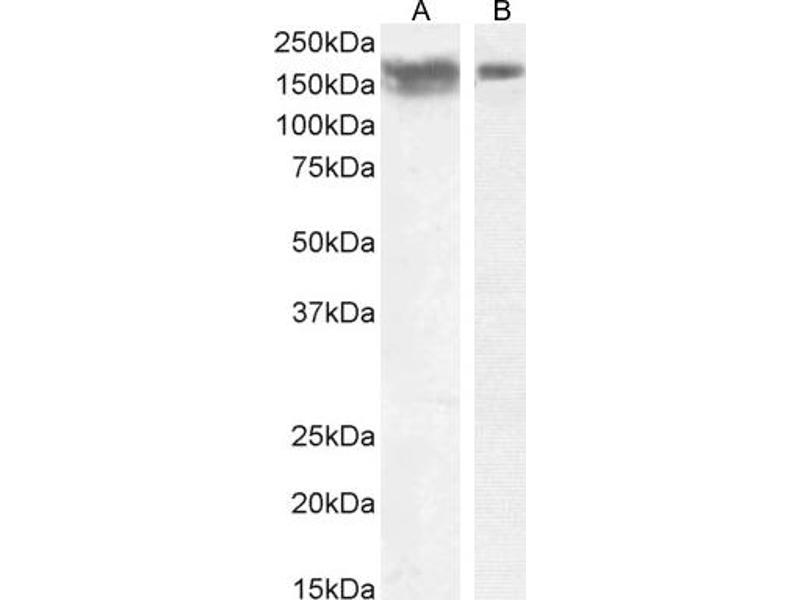 Western Blot: Approx 150-170 kDa band observed in Human Cerebellum and Frontal Cortex lysates (calculated MW of 94.6 kDa according to NP_851996.2). The observed molecular weight corresponds to the glycosylated form and is routinely observed by other source