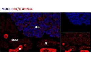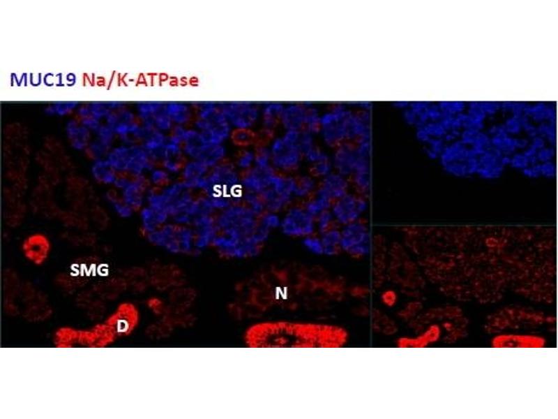ICC/ IF: Positive staining in the sublingual salivary gland of the mouse, while cells remain negative in the submandibular salivary gland. Data provided by Everest Grant winner Melinda Larsen, State University of New York, Albany, NY.