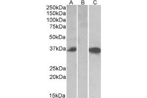 Western Blot: In transfected HEK293 transiently expressing full-length Human CMA1 (myc and DYKDDDDK tagged), a band of approx. 35 kDa was observed. No bands were observed in mock-transfected HEK293 and the same band was observed using anti-DYKDDDDK tag an