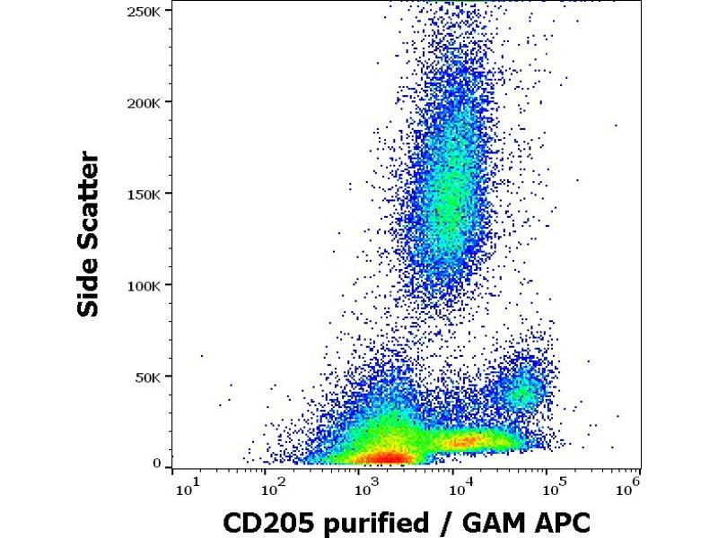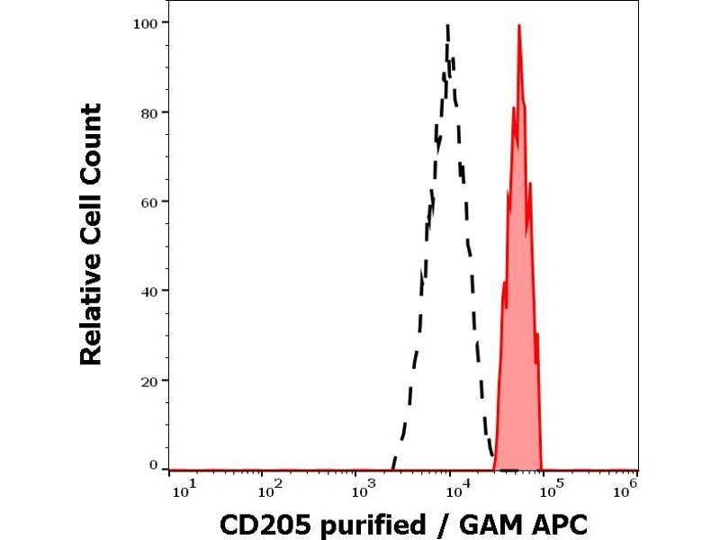 Lymphocyte antigen 75,CD205, also known as DEC-205, is an endocytic receptor of macrophage mannose receptor family. This 205 kDa C-type lectin transmembrane protein mediates adsorptive uptake and its intracellular domain contains coated pit localization sequence and distal acidic motif, which is required for recycling beyond early endosomes through deeper MHC II+ late endosomes and lysosomes. This unique pathway of receptor-mediated uptake proves to be necessary for presentation of antigenic peptides at low doses of ligand. CD205 is responsible for uptake and processing of captured antigens for dendritic cells.,DEC-205, LY75, CLEC13B