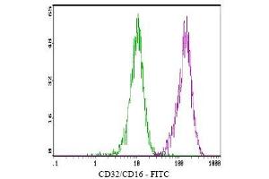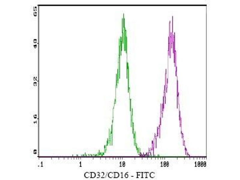 The lymphocyte Fc-gamma Receptors recognize the Fc portion of IgG, presented either as immune complexes or as free antibody. The different classes of receptors are distinct because of varying size, tissue distribution and affinity for IgGs. The Fc type II receptor is expressed on a wide variety of cells including B cells, hematopoietic cells, monocyte/macrophages, neutrophils, platelets, Langerhans cells, eosinophils, basophils, trophoblasts, and endothelial cells of the placenta. The Fc-gamma type III receptors are higher affinity than the type II and are expressed on macrophages, NK cells and neutrophils. Both types of receptors can be expressed on the same cell and in varying ratios. The receptors are constitutively expressed, although cytokines and lymphokines can modulate their expression. Besides identifying Fc-gammaR+ cells, monoclonal antibodies to the Fc-gammaII/III receptor have been used to block Fc receptor binding of IgG, Fcmediated signal transduction and effector functions, clearance of immune complexes and to attenuate infection by organisms dependent on Fc-gamma R for parasitic invasion.Synonyms: CD16a, FCG3, FCGR3A, Fc gamma receptor IIB, Fc-gamma RIII, Fc-gamma RIII-alpha, Fc-gamma RIIIa, Fc-gamma-RIIB, FcR mouse Seroblock, FcRII, FcRIII, FcRIIIa, Fcgr2, IGFR3, IgG Fc receptor III-2, Low affinity immunoglobulin gamma Fc region receptor III-A, Low affinity immunoglobulin gamma Fc region receptor III-B, Ly-17