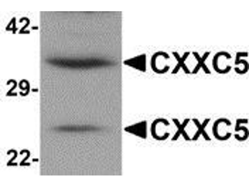 This antibody detects CXXC5 at N-term. At least two isoforms of CXXC5 are known to exist. CXXC5 antibody is predicted to not cross-react with other CXXC protein family members.