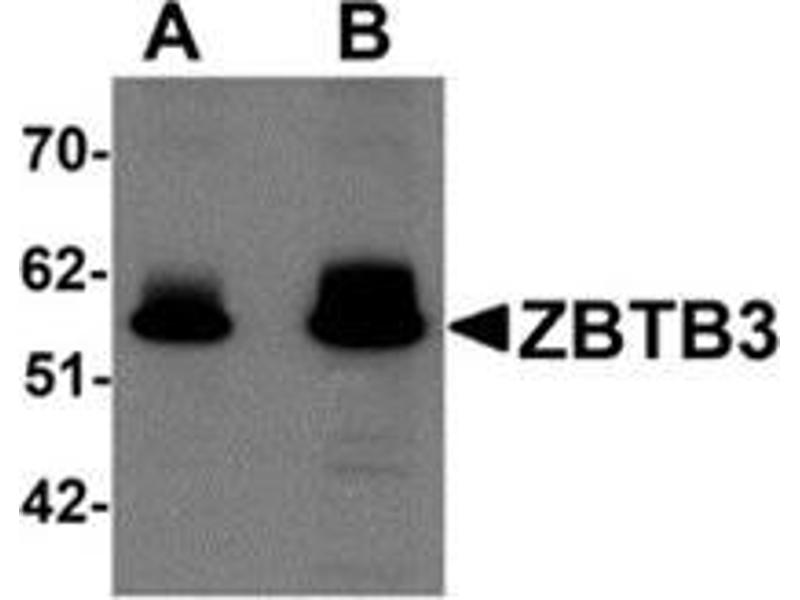 The ZBTB family of proteins is comprised of diverse zinc finger proteins that also contain a BTB (BR-C, ttk and bab) domain. While little is known about ZBTB3, the related protein ZBTB2 is thought to be phosphorylated in response to the DNA damage, probably by either ATM or ATR. Other ZBTB proteins, such as ZBTB4 and ZBTB38 bind methylated DNA and repress transcription, suggesting that ZBTB3 may also act as a transcription repressor.Synonyms: Zinc finger and BTB domain-containing protein 3