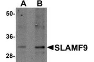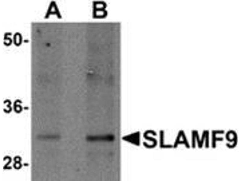 The SLAM (signalling lymphocyte activation molecule) family is a novel group of receptors on T cells in modulating the immune response. SLAMF9, also known as CD2F-10 or CD84 homolog, is a 289 amino acid type I transmembrane protein that shares 58 % identity with the mouse protein. The SLAMF9 protein is predominantly expressed in hematopoietic tissues and contains an extracellular region with only two N-linked glycosylation sites, a 20-residue transmembrane region and a highly positively charged 30-residue cytoplasmic tail, suggesting a role for SLAMF9 as an adhesion molecule. SLAMF9 is thought to function in the immune response as a coreceptor for lymphocyte activation.Synonyms: CD2 family member 10, CD2F-10, CD2F10, CD84 homolog 1, CD84-H1, SLAM family member 9