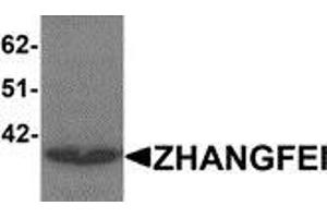 - ZHANGFEI, also known as ZF, is a basic region-leucine zipper transcriptional factor that has been implicated in herpes virus infection cycle and related cellular processes. ZHANGFEI protein has a negatively charged active N-terminus, a leucine zipper of six heptad leucine repeats separated by a conserved six amino acid spacer, a basic domain and a bZIP region. ZHANGFEI strongly activates transcription and suppresses the expression of HSV proteins in cells infected with the virus in a HCFC1 dependent manner. It also suppresses the HCFC1 dependent transcriptional activation by CREB3 and reduces the amount of CREB3 in the cell.Synonyms: CREB/ATF bZIP transcription factor, HCF-binding transcription factor Zhangfei, Host cell factor-binding transcription factor Zhangfei, ZF