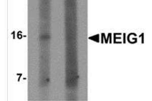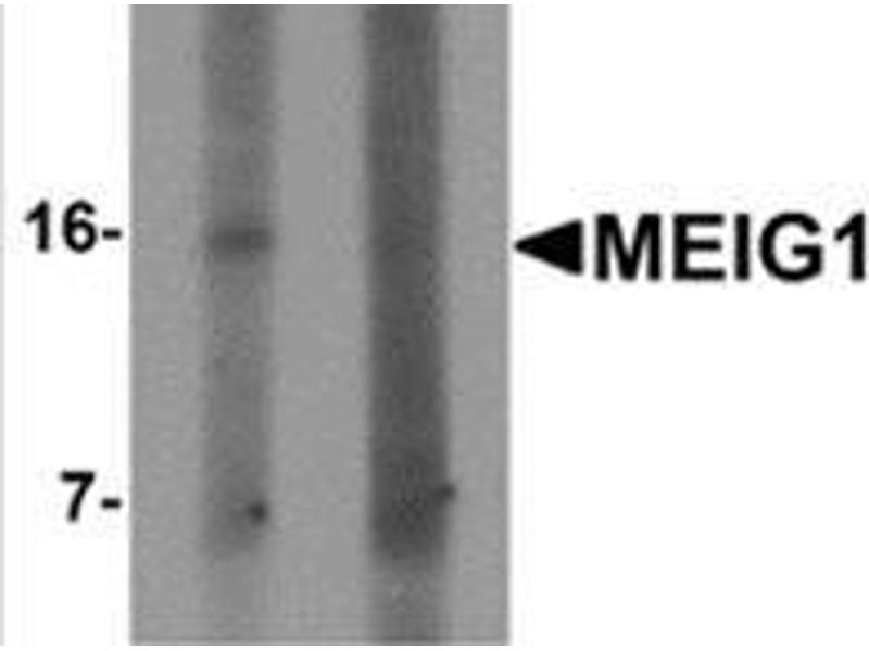 MEIG1, a murine gene first identified as a testis specific gene, is a chromosome/chromatin-binding protein initially expressed during meiosis but retained in the germ cell nucleus throughout later stages of spermatogenesis. MEIG1 is a highly conserved basal metazoan gene that is indispensable for mouse spermatogenesis. It is important for normal meiotic differentiation and absolutely crucial for terminal differentiation of spermatozoa. MEIG1 encodes two alternative transcripts, designated 2a2 and 11a2, both of which encode for a common ORF but differing in their 5? untranslated region (5?UTR) due to alternative promoters.Synonyms: Meiosis expressed gene 1 protein homolog