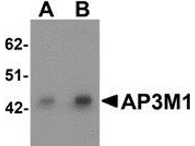 The AP3 complex is a heterotetramer composed of two large adaptins (AP3D1, AP3B1 or AP3B2), a medium adaptin (AP3M1 or AP3M2) and a small adaptin (APS1 or AP3S2). The complex is associated with the Golgi region as well as more peripheral structures. It facilitates the budding of vesicles from the Golgi membrane and may be directly involved in trafficking to lysosomes. AP3M1 is highly homologous to AP3M2 but is the preferred binding partner to the YQRL motif from the cytosolic domain of TGN38. AP3M1 has also been shown to interact with the HIV-1 virulence protein Nef.Synonyms: AP-3 adapter complex mu3A subunit, AP3M1, Adapter-related protein complex 3 mu-1 subunit, Mu-adaptin 3A, Mu3A-adaptin