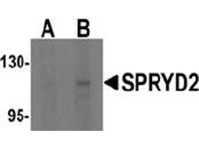 SPRYD2, also known as Myospryn, was originally identified as the muscle-specific partner of dysbindin and as a Mef-2 target gene. It is a large scaffolding protein localized to the Z-disc/costamere region of striated muscle. SPRYD2 includes a noncanonical tripartite motif (TRIM-like) that lacks the RING domain but consists of a B-box coiled coil (BBC), fibronectin 3 (FN3) repeats, and SPRY domains. SPRYD2 interacts with desmin and calcineurin, and it has been suggested to play a role in the biogenesis of lysosome and negatively regulates slow-fiber-type transformation and skeletal muscle regeneration. SPRYD2 is dysregulated in Duchenne muscular dystrophy.Synonyms: C5orf10, CMYA5, Cardiomyopathy-associated protein 5, DTNBP2, Dystrobrevin-binding protein 2, Genethonin-3, SPRY domain-containing protein 2, SPRYD2, TRIM76, Tripartite motif-containing protein 76