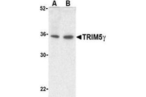 TRIM5 is a member of a broad family of otherwise unrelated proteins defined by the presence of a tripartite motif containing a RING domain, a B-box type 1, and a B-box type 2, followed by a coiled-coil region (1). TRIM5 has five alternately spliced isoforms, the longest of which is the ? variant which also contains a carboxy-terminal B30.2 (SPRY) domain (1). While a function has not yet been assigned to TRIM5γ, it is known that expression of TRIM5γ variants from humans, rhesus monkeys, and African green monkeys enable resistance to infection by various retroviruses including HIV-1 (2,3), albeit at differing efficiencies. Furthermore, the TRIM5γ isoform appears to serve as a scaffold for the assembly of endogenous BTBD1 and BTBD2 proteins and also exhibits autoubiquitination activity in a RING finger- and UbcH5B-dependent manner (4).Synonyms: RING finger protein 88, Tripartite motif-containing protein 5