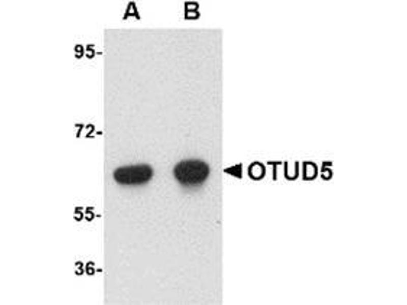 OTUD5 is a member of the OTU (ovarian tumor) domain-containing cysteine protease superfamily. The OTU domain confers deubiquitinase activity and OTUD5 has been shown to suppress the type I interferon (IFN-I)-dependent innate immune response by cleaving the polyubiquitin chain from TRAF3, an essential type I interferon adaptor protein. Cleavage results in disassociation of TRAF3 from a downstream signaling complex containing TBK1 and the disruption of the IFN-I signaling cascade, indicating that OTUD5 acts as a negative regulator of innate immune responses. It has been suggested that by suppressing IFN-I production, OTUD5 may function to inhibit the emergence of certain autoimmune disorders such as systemic lupus erythematosus. Multiple isoforms of OTUD5 are known to exist.Synonyms: DUBA, Deubiquitinating enzyme A, OTU domain-containing protein 5