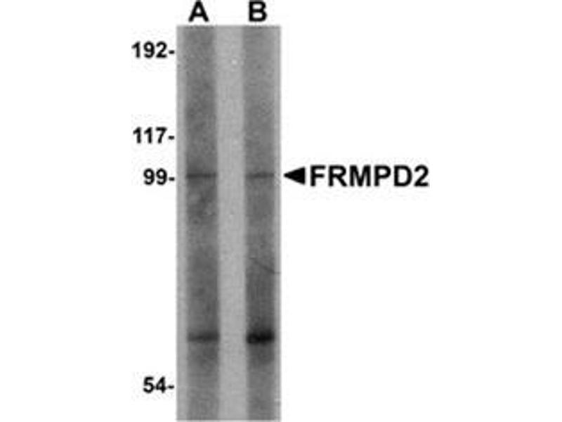 The FERM and PDZ domain containing (FRMPD) protein family consists of four proteins that contain a FERM (Four-point-one, erzin, radixin, moesin) domain and at least one PDZ (PSD-95/Discs large/Zonula-occuldens-1) domain. FRMPD2 also contains an N-terminal KIND domain and three PDZ domains and is structurally similar to the protein tyrosine phosphatase PTP-BL (4). FRMPD2 is localized in a polarized fashion in epithelial cells at the basolateral membrane and partially co-localizes with the tight-junction marker protein Zonula-occuldens-1. Suppression of FRMPD2 expression via RNAi in Caco-2 cells results in an impairment of tight junction formation, indicating that FRMPD2 plays a major role in tight junction formation. Other experiments indicate that FRMPD2 is a binding partner to several catenin family members and recruitment of FRMPD2 to cell-cell contacts is dependent on E-cadherin-mediated cell-cell adhesion.Synonyms: FERM and PDZ domain-containing protein 2, PDZ domain-containing protein 4, PDZ domain-containing protein 5C, PDZD5C, PDZK4, PDZK5C