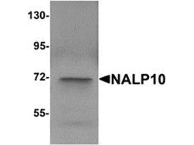 NALP proteins are cytoplasmic proteins that form a subfamily within the larger CATERPILLER family and are thought to play a crucial role in cell proliferation and reproduction. Like all other NALP family members, NALP10 has a C-terminal leucine-rich repeat (LRR) region, an N-terminal Pyrin domain (PYD) followed by a NACHT domain, and a NACHT-associated domain. It was initially identified as PYNOD, an Apaf-1-like protein that binds to ASC, caspase-1 and IL-1b, inhibiting the autoprocessing of caspase-1, caspase-1-mediated IL-1b processing, and ASC aggregation. NALP10 is thus a potent regulator of apoptosis and inflammation.Synonyms: NACHT LRR and PYD domains-containing protein 10, NALP10, NOD8, Nucleotide-binding oligomerization domain protein 8, PYNOD