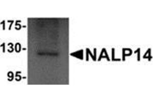 NALP proteins are cytoplasmic proteins that form a subfamily within the larger CATERPILLER family and are thought to play a crucial role in cell proliferation and reproduction. Like all other NALP family members, NALP14 has a C-terminal leucine-rich repeat (LRR) region, an N-terminal Pyrin domain (PYD) followed by a NACHT domain, and a NACHT-associated domain. While little is known about the function of NALP14, it has been suggested that it may play a role in spermatogenesis and that mutations in the NALP14 gene might cause spermatogenic failure.Synonyms: NACHT LRR and PYD domains-containing protein 14, NALP14, NOD5, Nucleotide-binding oligomerization domain protein 5