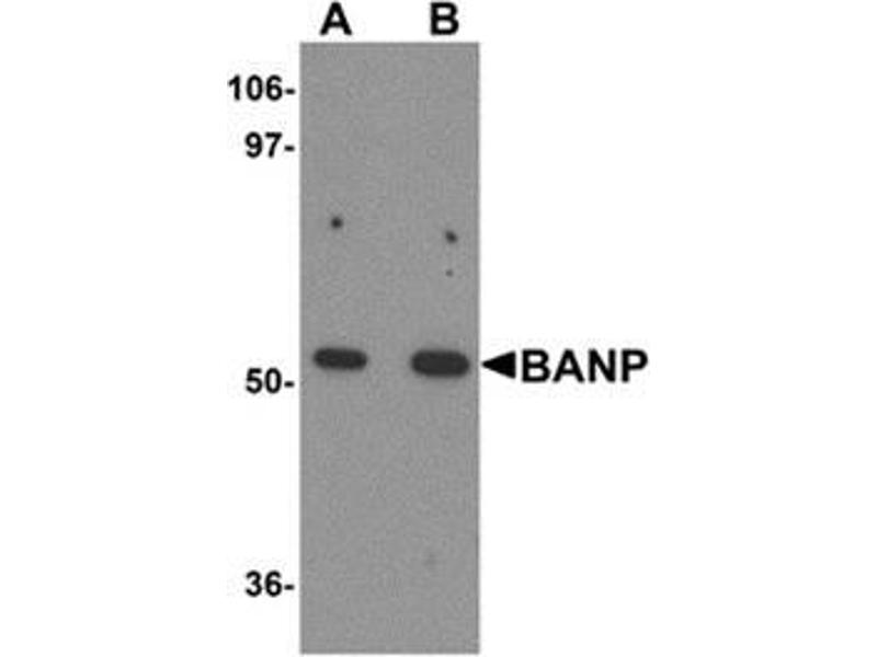 BANP was initially identified as a binding protein to BTG3 in a yeast two-hybrid screen. BANP acts as a tumor suppressor by stabilizing p53 expression and leading to cell cycle arrest. p53 in turn binds to upstream elements of the BANP promoter, thereby forming a feedback loop. BANP is down-regulated in advanced stages of human breast cancer, and its overexpression in breast cancer cell lines inhibits their ability to metastasize by modulating TGF-b signaling. Furthermore, BANP can modulate NF-kB transactivation and can inhibit tumorigenesis by regulating NF-kB target genes. Recent experiments have shown that BANP can also repress HIV-1 LTR mediated transcription by tethering the LTR matrix attachment region to nuclear matrix.Synonyms: BEN domain-containing protein 1, BEND1, Btg3-associated nuclear protein, Scaffold/matrix-associated region-1-binding protein