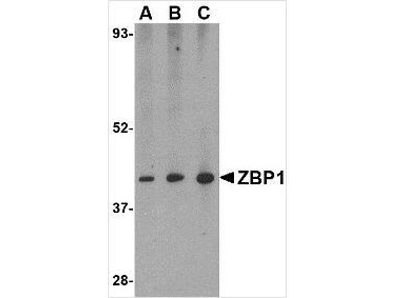 Z-DNA binding protein 1 (ZBP1) belongs to a family of proteins that contain the Za domain which binds specifically to left-handed Z-DNA and Z-RNA. ZBP1 was initially identified as a novel gene that was up-regulated in activated macrophages in mice bearing ascites tumors, suggesting that is may play a role in processes such as host response in neoplasia. More recent reports indicate that the cytosolic ZBP1 has can act like the toll-like receptor TLR9 by detecting cytosolic double-stranded (ds) DNA and trigger induction of type I interferon and other innate immune responses. It is thought that the binding of ZBP1 to dsDNA enhances its association with innate immune response proteins such as the IRF3 transcription factor and the serine/threonine kinase TBK1 (also known as NAK). Multiple isoforms of ZBP1 are known to exist.Synonyms: C20orf183, DLM1, Z-DNA-binding protein 1