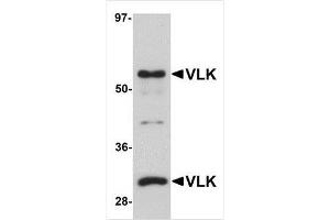 VLK was identified as a novel protein kinase that was induced after the differentiation of cultured embryonic stem cells into mesendoderm. It has no homologs in invertebrates, but is highly conserved in vertebrate species although it does not belong to any known protein kinase groups. VLK is initially expressed in E-cadherin-positive anterior visceral endoderm and mesendoderm, but its expression is later confined to E-cadherin-negative mesenchyme. It is enriched in the Golgi apparatus and is thought to regulate the rate of protein export from the Golgi. Targeted disruption of VLK in mice leads to a defect in lung development and neonatal lethality. It has been suggested that mutations in VLK may be associated with the allergic condition atopy.Synonyms: LOC91461, Protein kinase domain-containing protein, Protein kinase-like protein SgK493, Sugen kinase 493, VLK, Vertebrate lonesome kinase