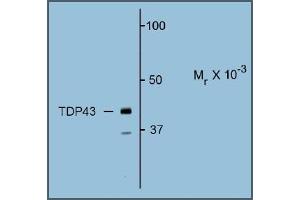 TDP43 (Tar DNA Binding 43, TARDBP) was originally identified as a protein which binds to the "transactivation response" (TAR) sequence found in the long terminal repeat of the HIV-1 virus genome (Ou et al.,1995). UV cross-linking of HeLa cell extract revealed a 43 kDa protein which was cloned and sequenced and shown to contain two copies of the ~90 amino acid RRM domain. RRM is an acronym for RNA Recognition Motif, and this domain is found in many proteins which bind single stranded RNA and some which bind single stranded DNA. Northern blots showed that the protein is ubiquitous in tissue expression. Much interest has been focused on TDP43 recently due to its association with the inclusions seen in frontotemporal lobar degeneration and Amyotrophic Lateral Sclerosis (Neumann et al., 2006). The protein is present in these inclusions in partially degraded, hyperphosphorylated and ubiquitinated forms.Synonyms: TAR DNA-binding protein 43, TDP-43, TDP43