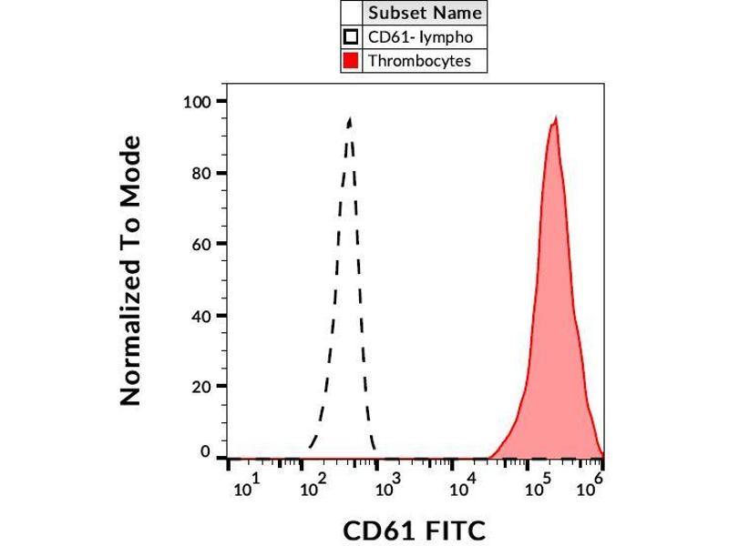 The mouse monoclonal antibody VIPL2 recognizes an extracellular epitope of CD61, a 90-110 kDa transmembrane glycoprotein of integrin family, expressed on platelets, megacaryocytes, osteoclasts, endothelial cells and other cell types, including leucocytes and smooth muscle cells.