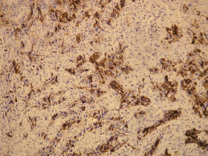 - Anti-EMA antibody is a useful marker for staining several types of carcinomas. It stains normal and neoplastic cells from various tissues, including mammary epithelium, sweat glands and squamous epithelium. Hepatocellular carcinoma, adrenal carcinoma and embryonal carcinomas are consistently EMA negative, so keratin positivity with negative EMA favors one of these tumors. EMA is frequently positive in meningiomas, breast, ovary, lung and prostate tumors.